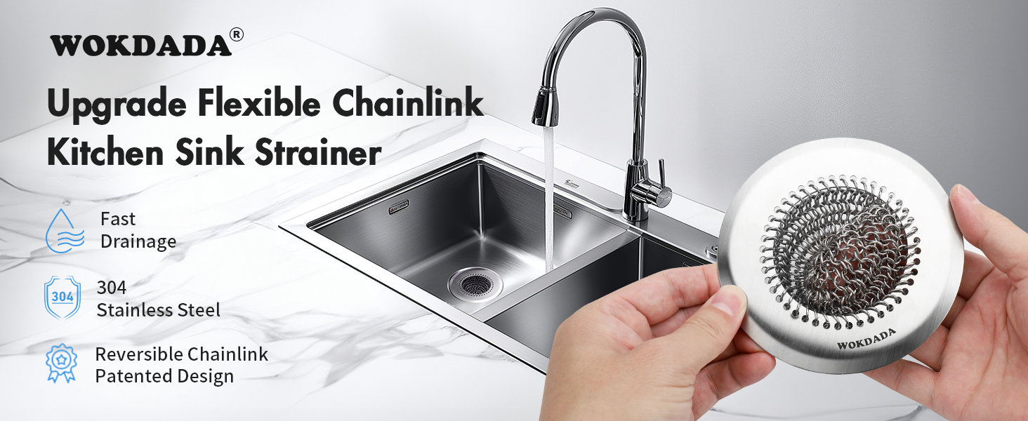WOKDADA 2 Pcs Sink Drain Strainer: Anti-Slip Flexible Chainlink, 304 Stainless Steel. Upgraded Clog-Free Kitchen Version, Easy-Clean Catcher for Garbage Disposal